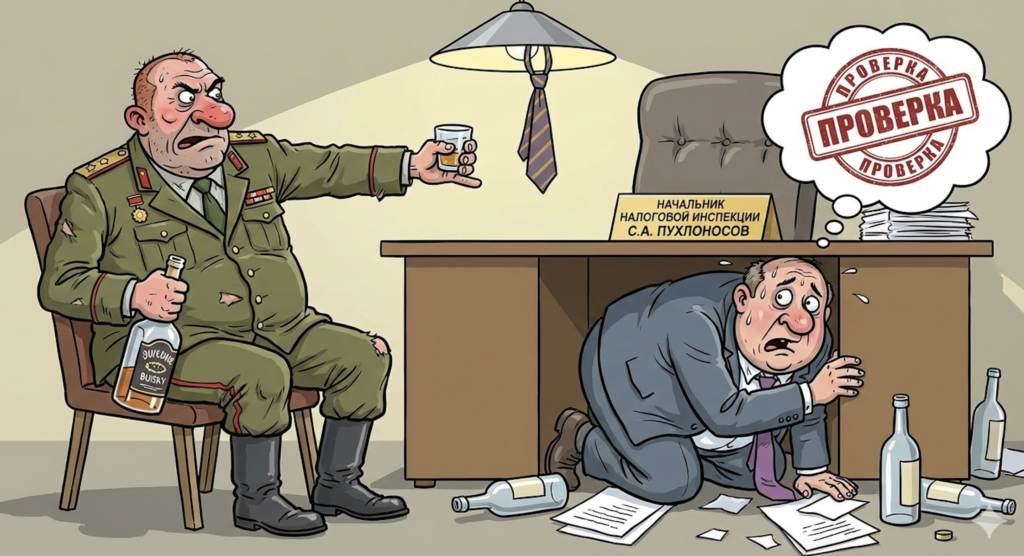 Пухлоносов выкатился навстречу и замер. Перед ним стоял офицер в парадном кителе с артиллерийскими эмблемами. В мозгу начальника налоговой, изъедённом схемами ухода от НДС, пронеслась паническая мысль: «Военная прокуратура? Нет… Следственный комитет? Тоже нет… Неужели… Неужели ввели новую форму для Высшего Аудиторского Состава, а я приказ в спам отправил?! Или это… (он похолодел) …Военно-Полевой Аудит?! В стране же ситуация сложная! Всё, конец. Пришли раскулачивать по законам военного времени!»