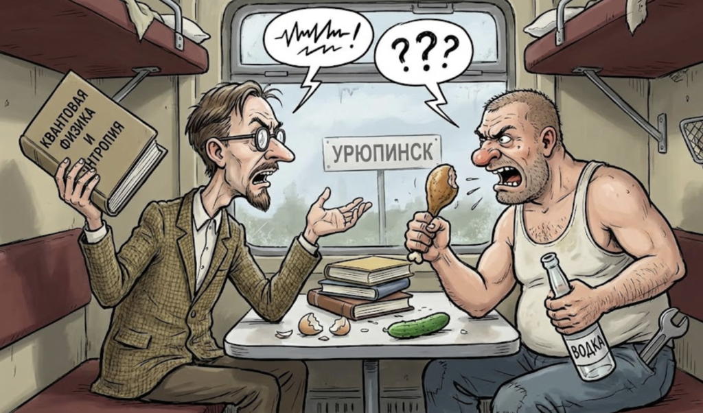 — Зато я живу! — ревел Михалыч, вставая во весь рост. Купе стало тесным, как гроб. — А ты существуешь! Ты паразит на теле рабочего класса! Я налоги плачу, чтоб ты в своем НИИ бумажки перекладывал! Ты ж тяжелее авторучки ничего не поднимал! Случись война или потоп — ты ж первый сдохнешь без нас! Кто тебе хлеб испечет? Кто тебе свет даст? Кто тебе, в конце концов, задницу подотрет, когда канализация встанет? Твоя квантовая физика?