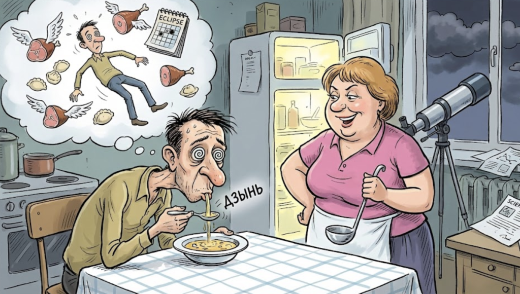 А всё почему? Затмение же! Завтра! Небесная механика, понимаешь, вступает в критическую фазу! Солнце закрывают, Уран бушует! Куда ж в такой момент пельмени в себя пихать? Это же кощунство! Сосуд должен быть пуст! Чтобы, значит, когда космическая энергия хлынет, она там не застряла в макаронах по-флотски.